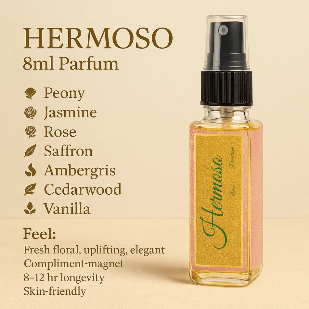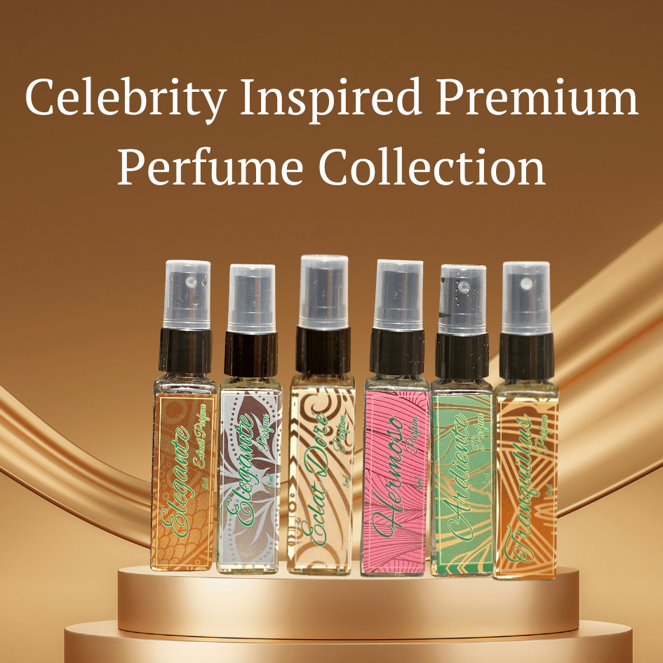 The collection includes six 8ml premium miniatures inspired by iconic celebrity fragrances: Ardiente: Inspired by Dunhill Alfred Icon Absolute Elegante: Inspired by Baccarat Rouge 540 Éclat Doré: Inspired by Chanel No. 5 Hermoso: Inspired by Gucci Flora Tranquillus: Inspired by Diptyque Tam Dao Elegante Extrait: Inspired by Baccarat Rouge 540 Extrait Each perfume is crafted with a 35% premium oil concentrate for a luxurious and long-lasting experience.