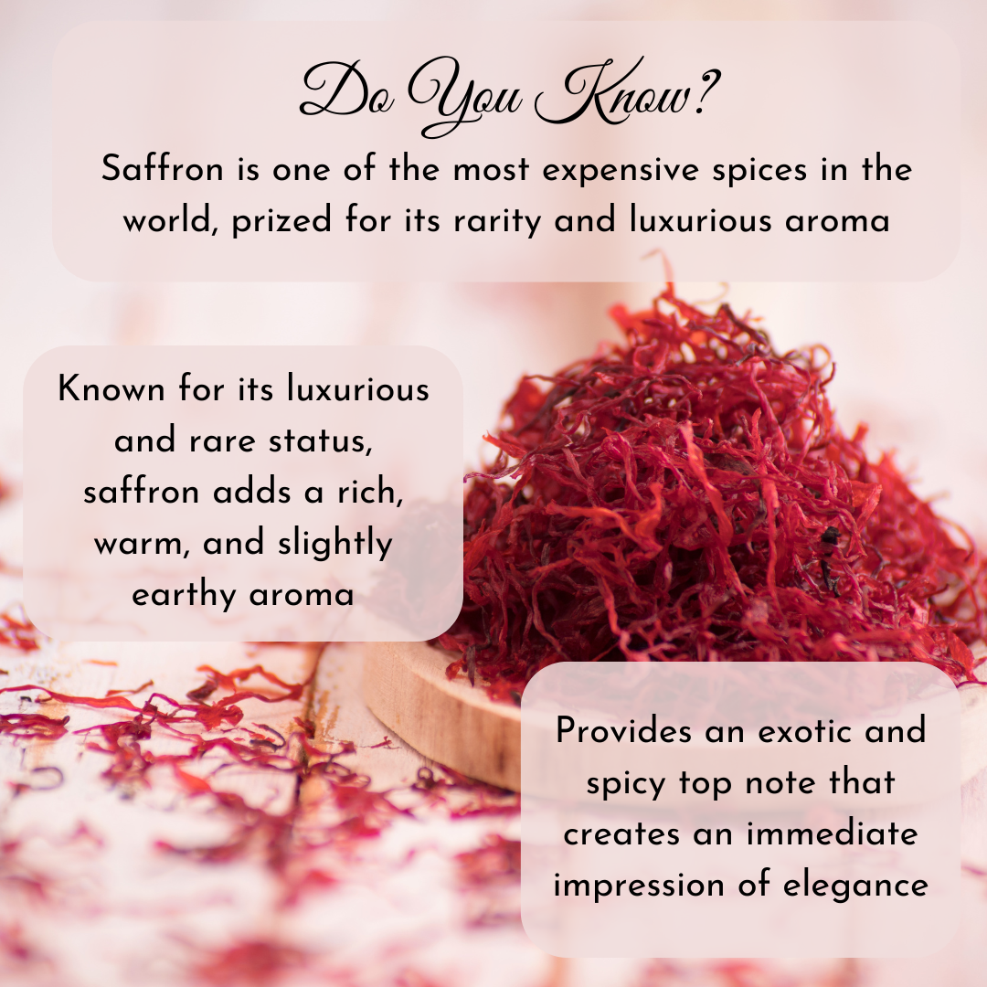 The fragrance features a rich blend of saffron, jasmine, amberwood, ambergris, fir resin, cedarwood, and benzoin, creating a harmonious balance of sweet, woody, and musky notes.